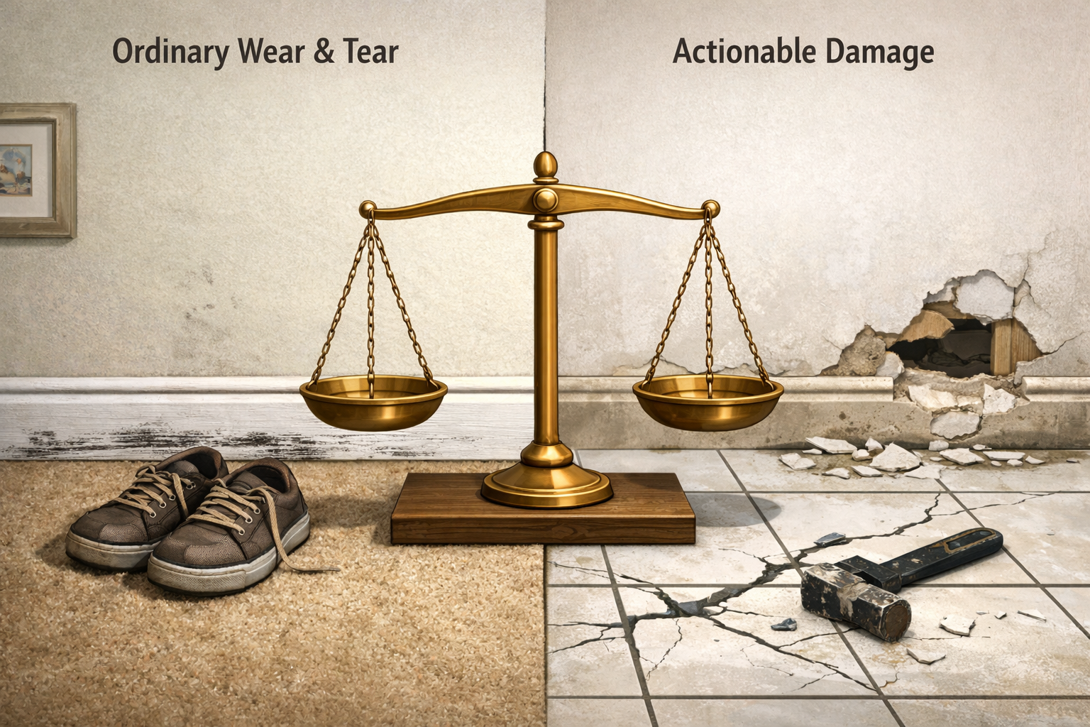 This is the central battlefield of security deposit litigation. The law distinguishes between “ordinary wear and tear”(the natural deterioration of a properties like faded paint, worn carpet pile, small nail holes)and "actual damage" (e.g., broken windows, large holes in drywall, or pet-related floor destruction). Landlords who attempt to charge tenants for the cost of "refreshing" a unit for the next occupant are often found to have made unlawful deductions.