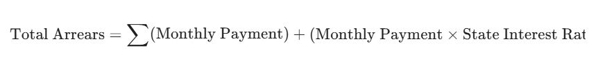 Unpaid support accumulates interest at a rate set by state law. In many jurisdictions, this interest is mandatory and cannot be waived by the judge. We use the following logic to calculate the total debt: